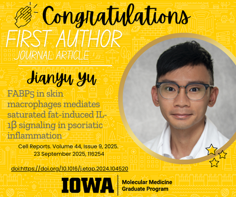Jianyu’s paper, “FABP5 in skin macrophages mediates saturated fat-induced IL-1β signaling in psoriatic inflammation”, provides important new insight into the connection between diet, immune cell signaling, and psoriatic inflammation. His findings shed light on the molecular pathways that link saturated fats to chronic inflammatory disease, advancing our understanding of both skin biology and potential therapeutic strategies.